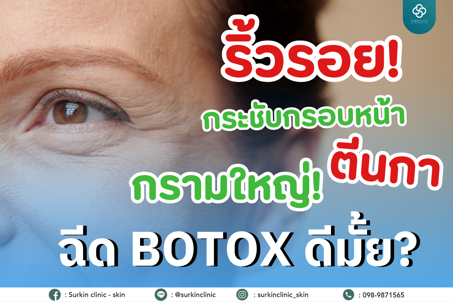ถ้าอยากลดริ้วรอย ลดกราม ปรับหน้าเรียว ฉีดโบท็อกหรือผ่าตัดดี ? สำหรับริ้วรอยการฉีดโบท็อก (Botox) จะช่วยรักษาริ้วรอยบนใบหน้า ลดรอยเหี่ยวย่นหน้าผาก หางตา ตีนกา BOTOX ช่วยลดริ้วรอยที่เกิดจากการแสดงอารมณ์ต่าง ๆ ทำให้ใบหน้าดูอ่อนเยาว์มากขึ้น
