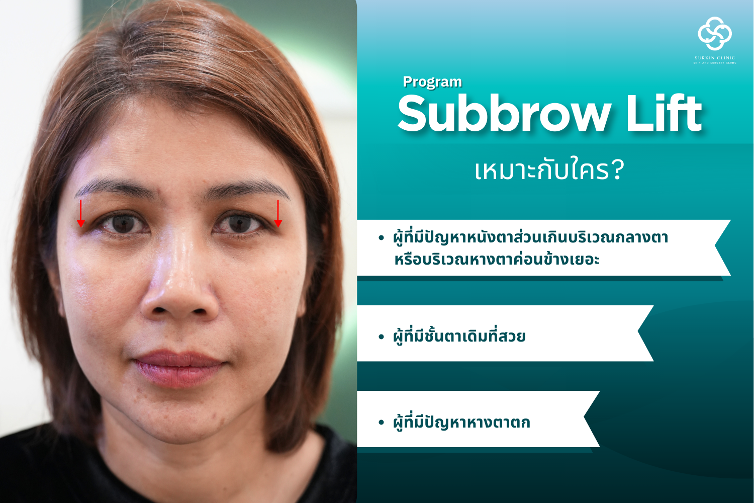 เผยให้เห็นชั้นตาธรรมชาติ สวยย้อนวัย โดยเฉพาะบุคคลที่มีปัญหาความหย่อน หรือมีหนังส่วนเกิน บริเวณหางตา หรือที่เรียกว่าหางตาตก หนังทับชั้นตาเดิม การทำ subbrow lift ไม่ใช่การเปลี่ยนตำแหน่งคิ้ว จึงไม่สามารถทำให้คิ้วสูงขึ้น หรือยกคิ้วขึ้นได้ subbrow lift เป็นวิธีช่วยยกหนังตาบนให้ดูสดใสมากขึ้น โดยไม่จำเป็นต้องดึงคิ้วทั้งหมดขึ้นด้านบน